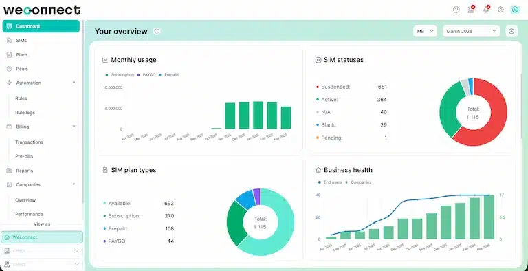 Sie können die Umstellung auf eSIM in Ihrem eigenen Tempo an Ihren Geräteerneuerungszyklus anpassen. Für Unternehmen mit Dual-SIM-Konfigurationen – also einer primären Firmen-SIM für Telefonie und einer Weconnect eSIM für internationale Daten – erfasst die Plattform beide Nutzungsströme unabhängig voneinander. Sie benötigen daher in der Zwischenzeit keine zwei separaten Managementsysteme.